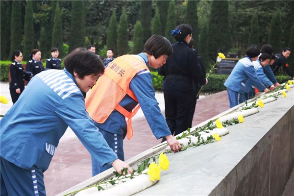 在四川省汶川映秀镇漩口中学地震遗址纪念表盘雕塑前,成都女子监狱16名女性服刑人员在民警的带押下,静静肃立。随着解说员的指引,她们默哀、躹躬……冷风吹过,气氛凝重,将这一幕回溯到了十年前天崩地裂的一瞬。16名服刑人员面色悲恸,她们将手中的菊花,轻轻放置在了汶川特大地震记事墙前方。