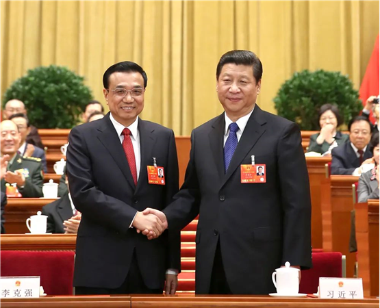 2013年3月15日,第十二届全国人民代表大会第一次会议在北京人民大会堂举行第五次全体会议。会议经过投票表决,决定李克强为中华人民共和国国务院总理。这是习近平同志和李克强同志亲切握手。新华社记者 兰红光 摄