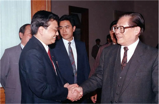 1993年5月3日下午,中国共产主义青年团第十三次全国代表大会在北京人民大会堂开幕。在5月3日上午的预备会议后,举行第一次主席团会议,推选李克强等同志为主席团常务主席。这是江泽民同志与李克强同志握手。新华社记者 郭占英 摄