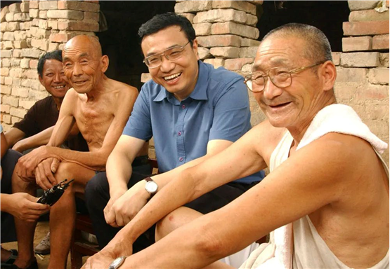 2003年8月8日,李克强同志在河南省新乡市调研。这是李克强同志在原阳县桥北乡马庄村与村民亲切交谈。新华社发(郭宇 摄)