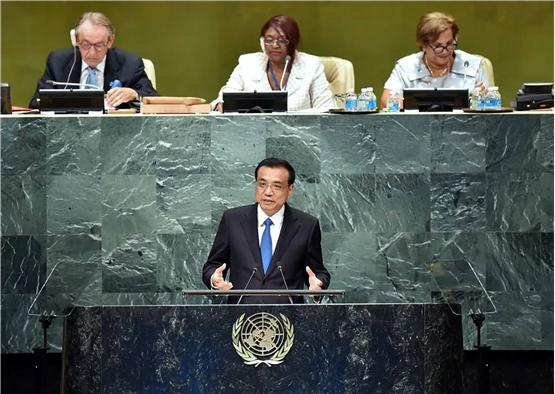 2016年9月21日,李克强同志在纽约联合国总部出席第71届联合国大会以“可持续发展目标:共同努力改造我们的世界”为主题的一般性辩论并发表题为《携手建设和平稳定可持续发展的世界》的讲话。新华社记者 李涛 摄