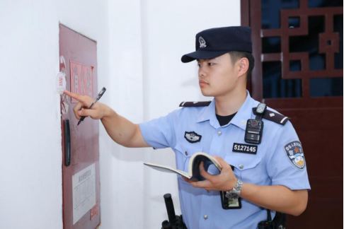 “最近天气变化,消防器材必须逐个检查。”民警杨浩桓站在走廊的消防栓前,目光落在箱体外侧——箱外封条边角平整无破损,上面印着的日期清晰可辨;消防栓周边地面无积水、没有杂物堆积;箱体接缝处干爽,没有水管渗水的痕迹。