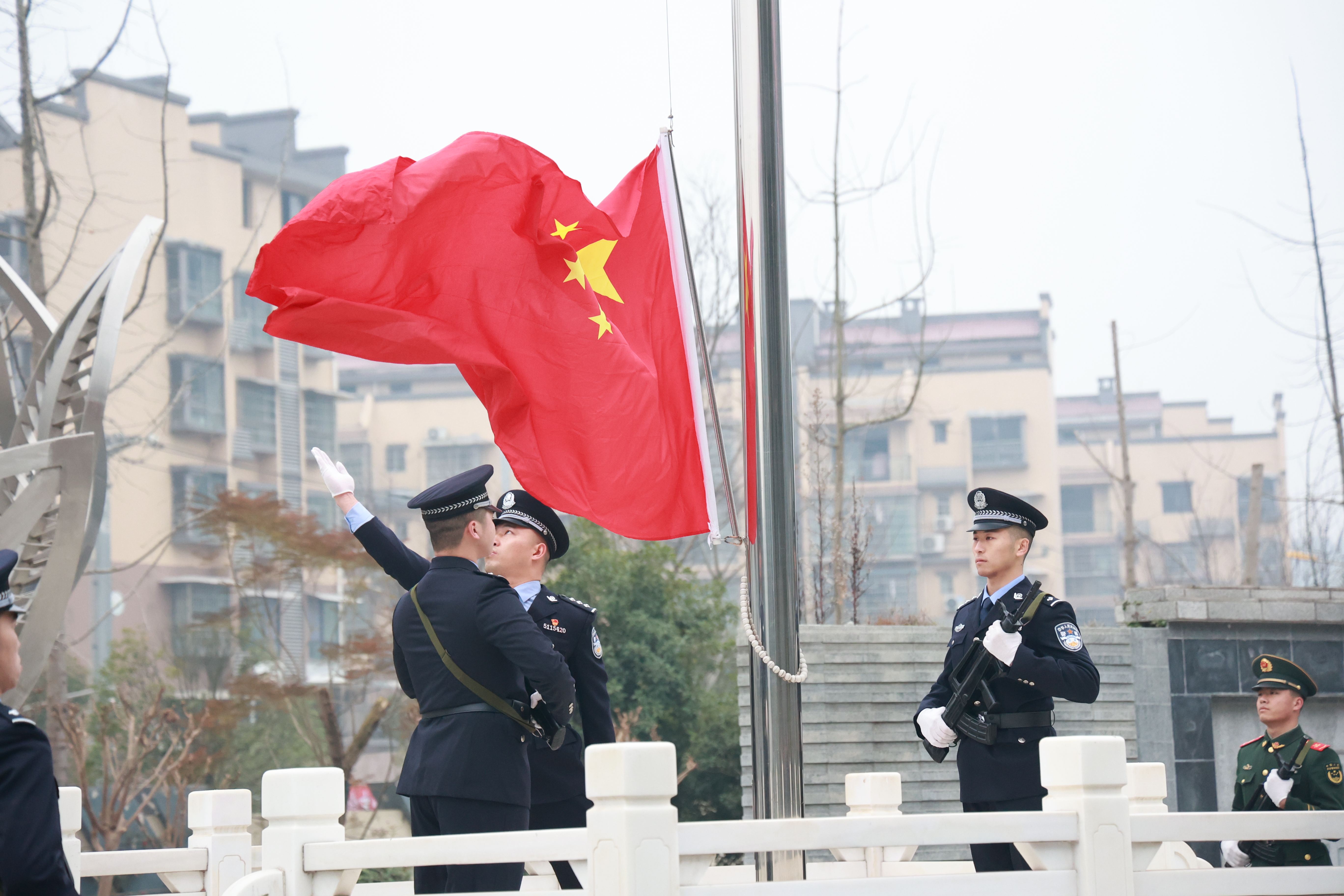 “正步走!” 随着指令,护旗民警迈着铿锵步伐护送国旗至旗杆下,展旗、扬臂,鲜红的旗帜在晨风中舒展飘扬。民警们身着警服、身姿挺拔,目光追随着国旗升至杆顶,庄重的敬礼里,饱含着对新一年坚守岗位、筑牢监管安全防线的决心。