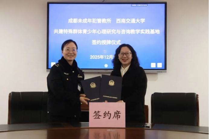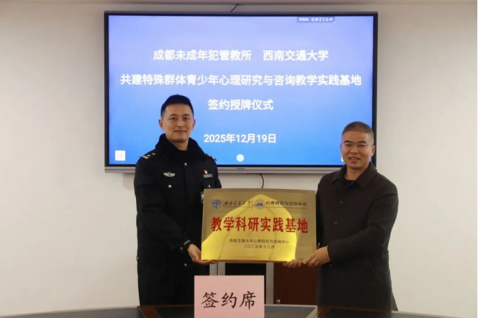为整合高校科研优势与司法实践需求,12月19日,我所与西南交通大学心理研究与咨询中心隆重举行“共建特殊群体青少年心理研究与咨询教学实践基地”签约授牌仪式。西南交大心理研究与咨询中心主任高雪梅教授与党委书记、所长毛新共同签署协议,并为基地授牌。高雪梅主任一行在所领导陪同下,实地调研了所内青少年罪犯技能培训中心、入监管区、心理矫治中心及“七色光”青少年违法犯罪联合防范中心等。