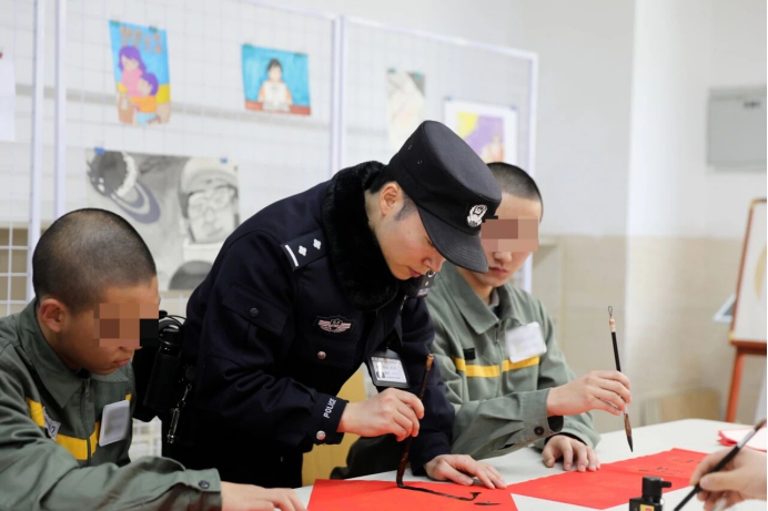 “腊月廿八,贴花花”,放假第一天恰逢腊月二十八,所内精心组织未成年犯书写春联迎接新春。长桌之上铺展开大红的宣纸,民警手把手指导着他们握笔、运腕的要领。不多时,一副副春联便跃然纸上,大家挑选出最满意的作品,待墨迹晾干,便将它们贴满监舍门廊。