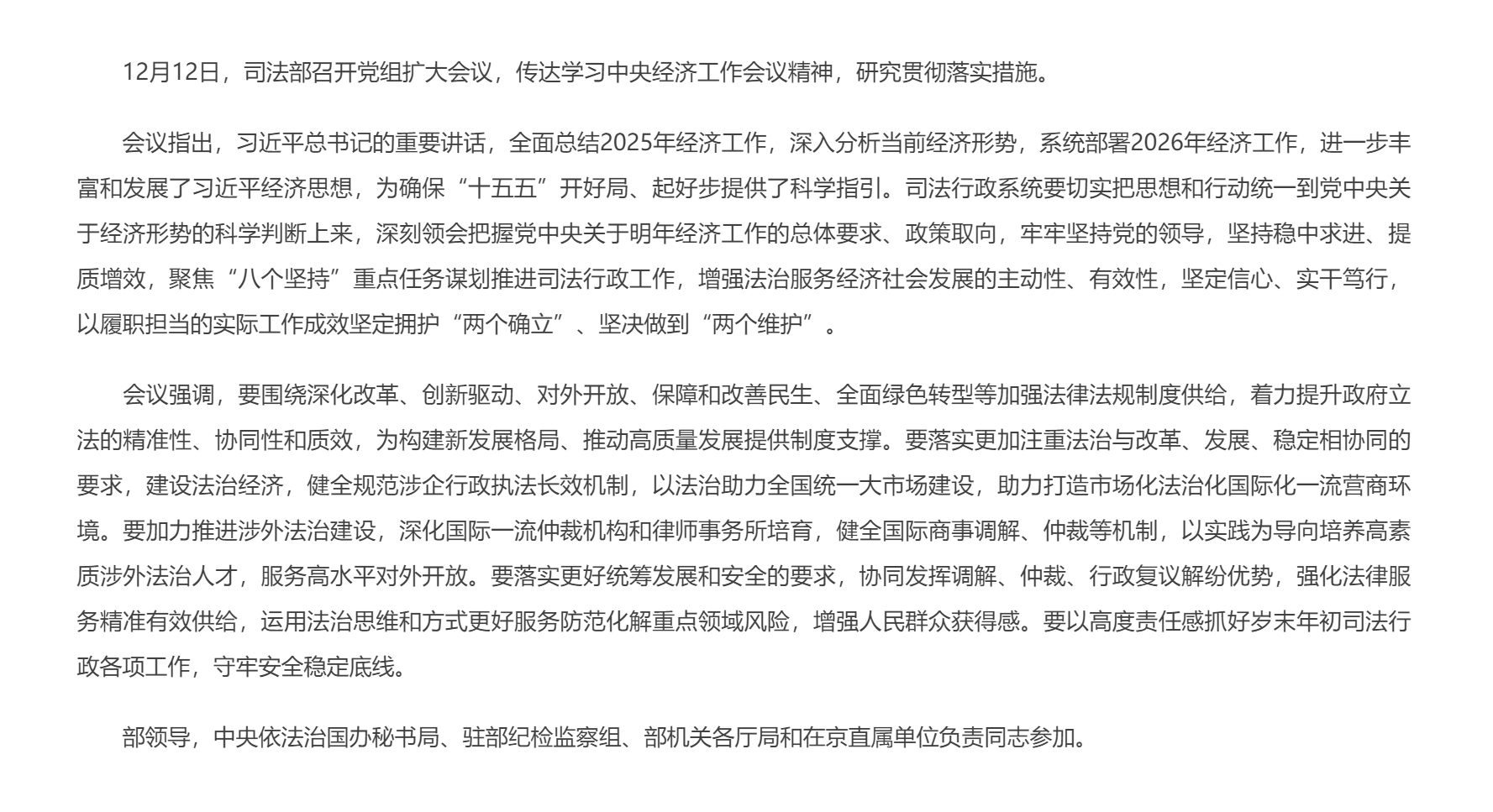 司法部:深入学习贯彻中央经济工作会议精神切实做好“十五五”开局之年司法行政工作