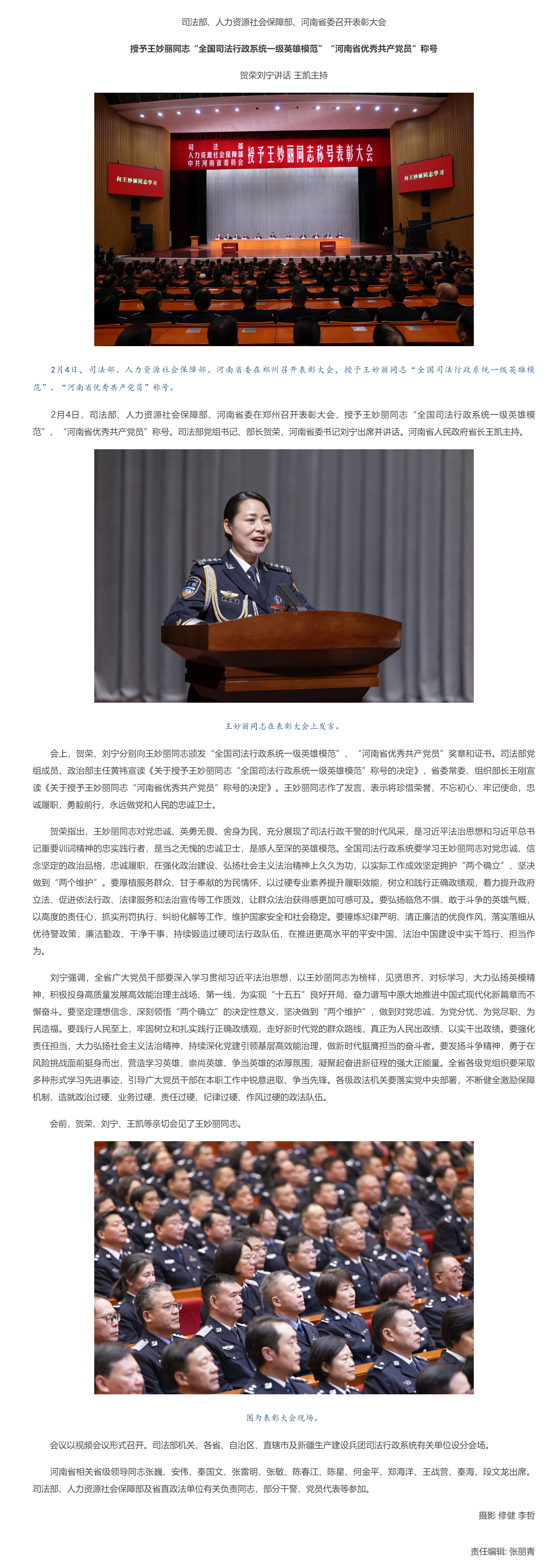 司法部、人力资源社会保障部、河南省委召开表彰大会授予王妙丽同志“全国司法行政系统一级英雄模范”“河南省优秀共产党员”称号