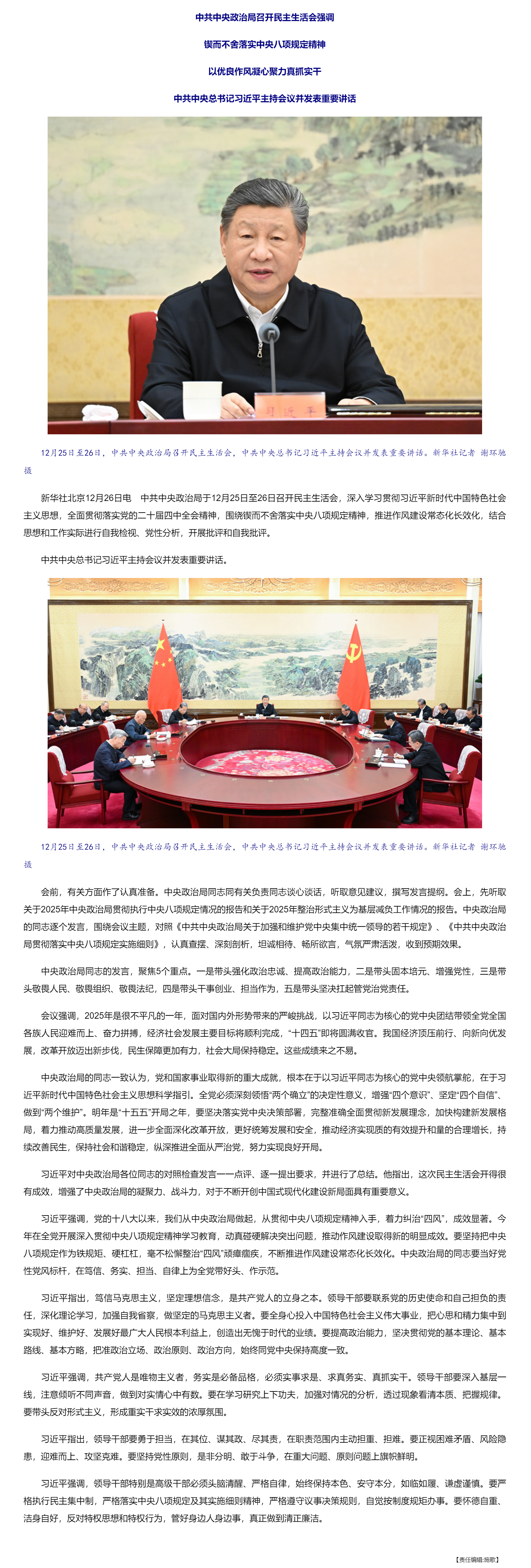 中共中央政治局召开民主生活会 中共中央总书记习近平主持会议并发表重要讲话