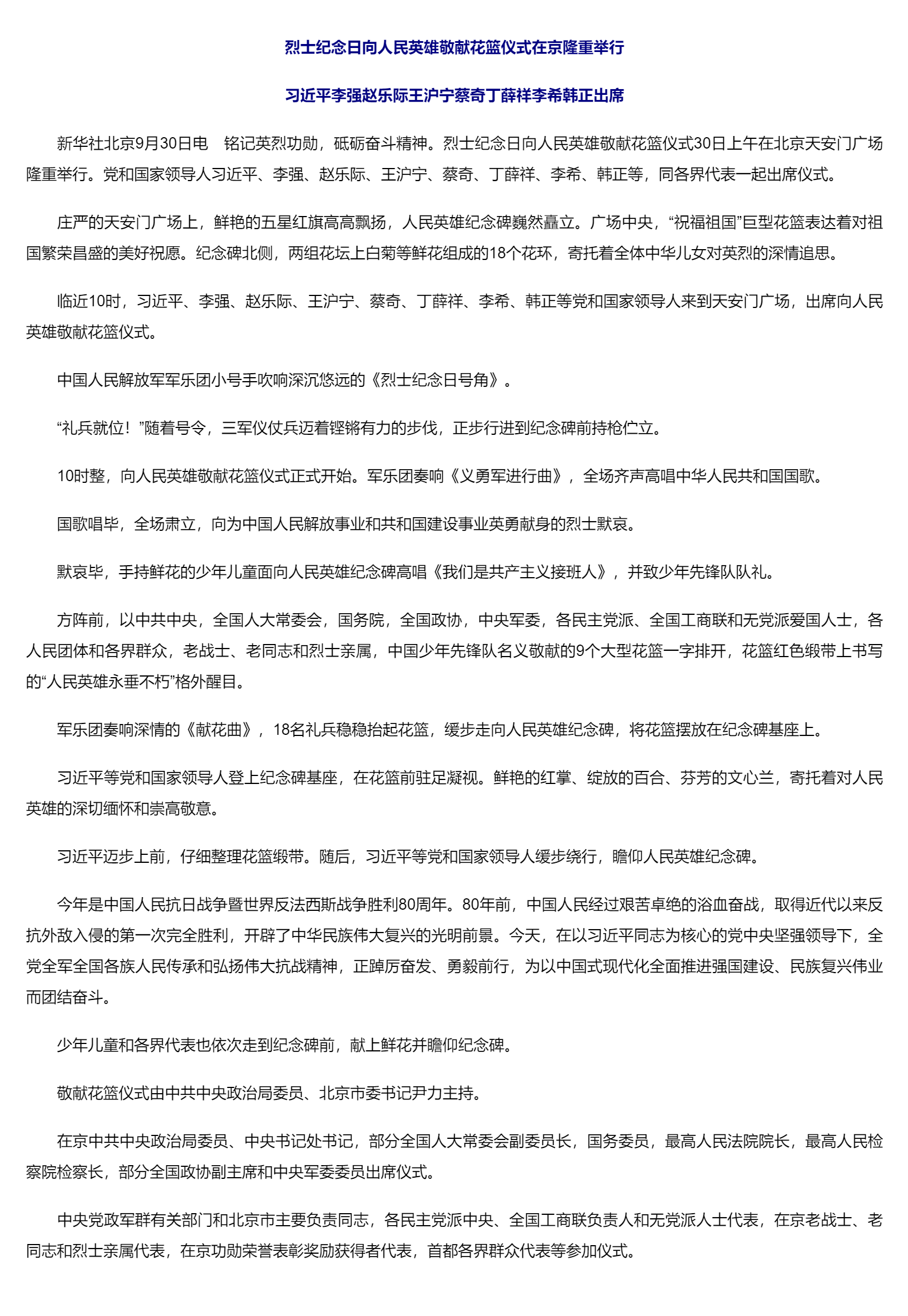 烈士纪念日向人民英雄敬献花篮仪式在京隆重举行 习近平等党和国家领导人出席