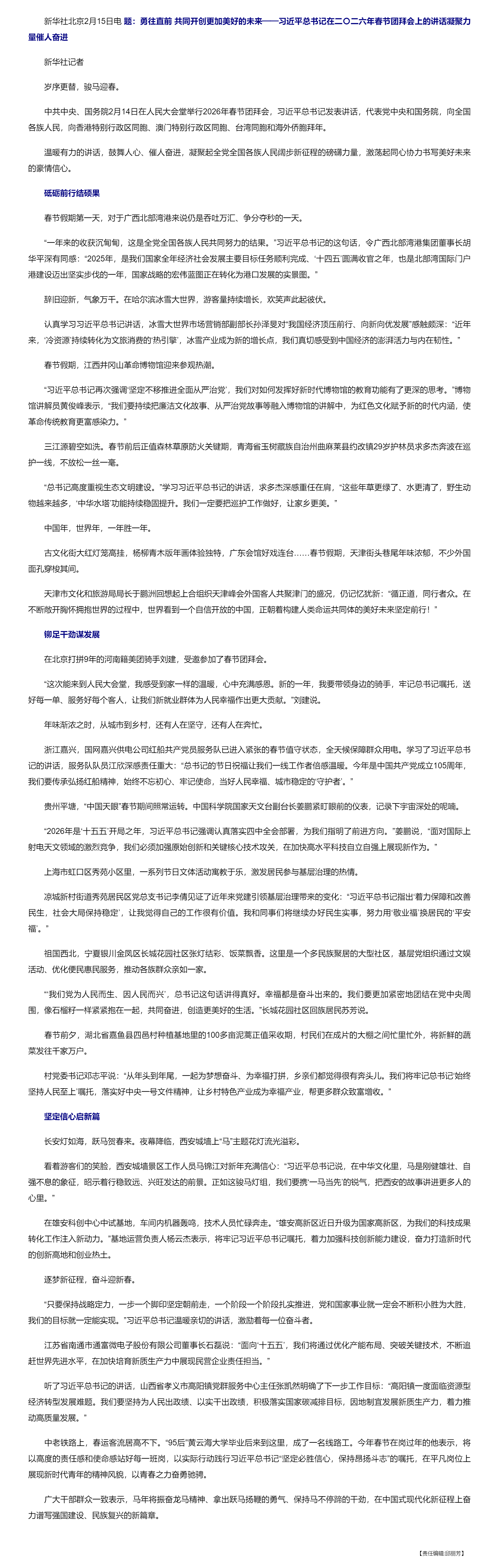 勇往直前 共同开创更加美好的未来——习近平总书记在二〇二六年春节团拜会上的讲话凝聚力量催人奋进