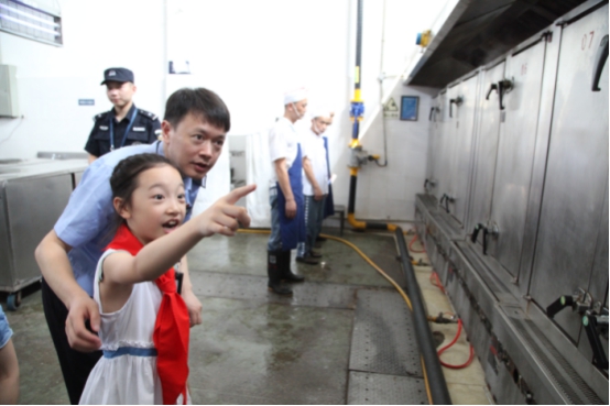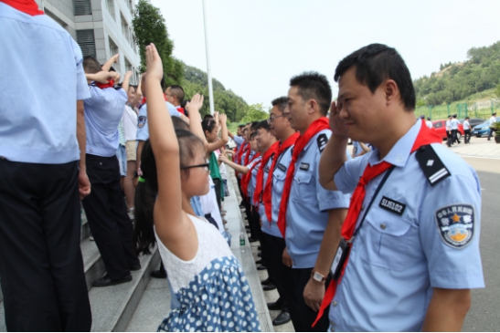 在升旗广场上,小朋友们将自己佩戴的红领巾给父母戴上,并向父母敬了一个标准的少先队队礼,道了一声:爸爸妈妈,辛苦了。在近两个小时的参观时间里,小朋友们顶着烈日,冒着酷暑,真切地感受到了父母工作的艰辛,也认识到了自由生活来之不易,纷纷表示要珍惜现在的美好生活,努力学习,不让父母操心。