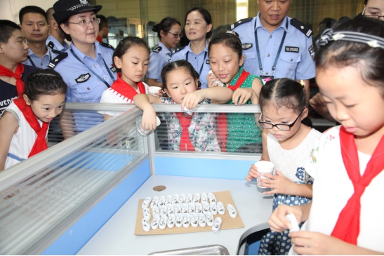 在劳动改造现场,透过玻璃,小朋友们看到了整洁规范有序的劳动现场、在现场值班坚守的民警和正在劳动改造的服刑人员,小朋友们还兴致盎然地观看了各类产品。 参观完监管区,监狱还特意组织小朋友们体验了特警队员巡逻和AB门安检的工作。