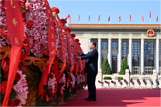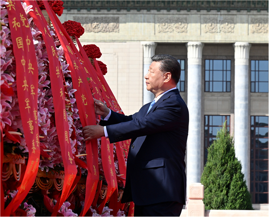 9月30日上午,党和国家领导人习近平、李强、赵乐际、王沪宁、蔡奇、丁薛祥、李希、韩正等来到北京天安门广场,出席烈士纪念日向人民英雄敬献花篮仪式。这是习近平整理花篮上的缎带。