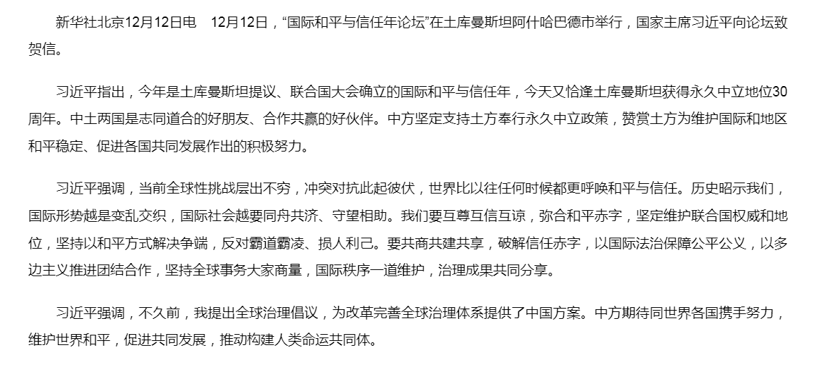 习近平向土库曼斯坦“国际和平与信任年论坛”致贺信