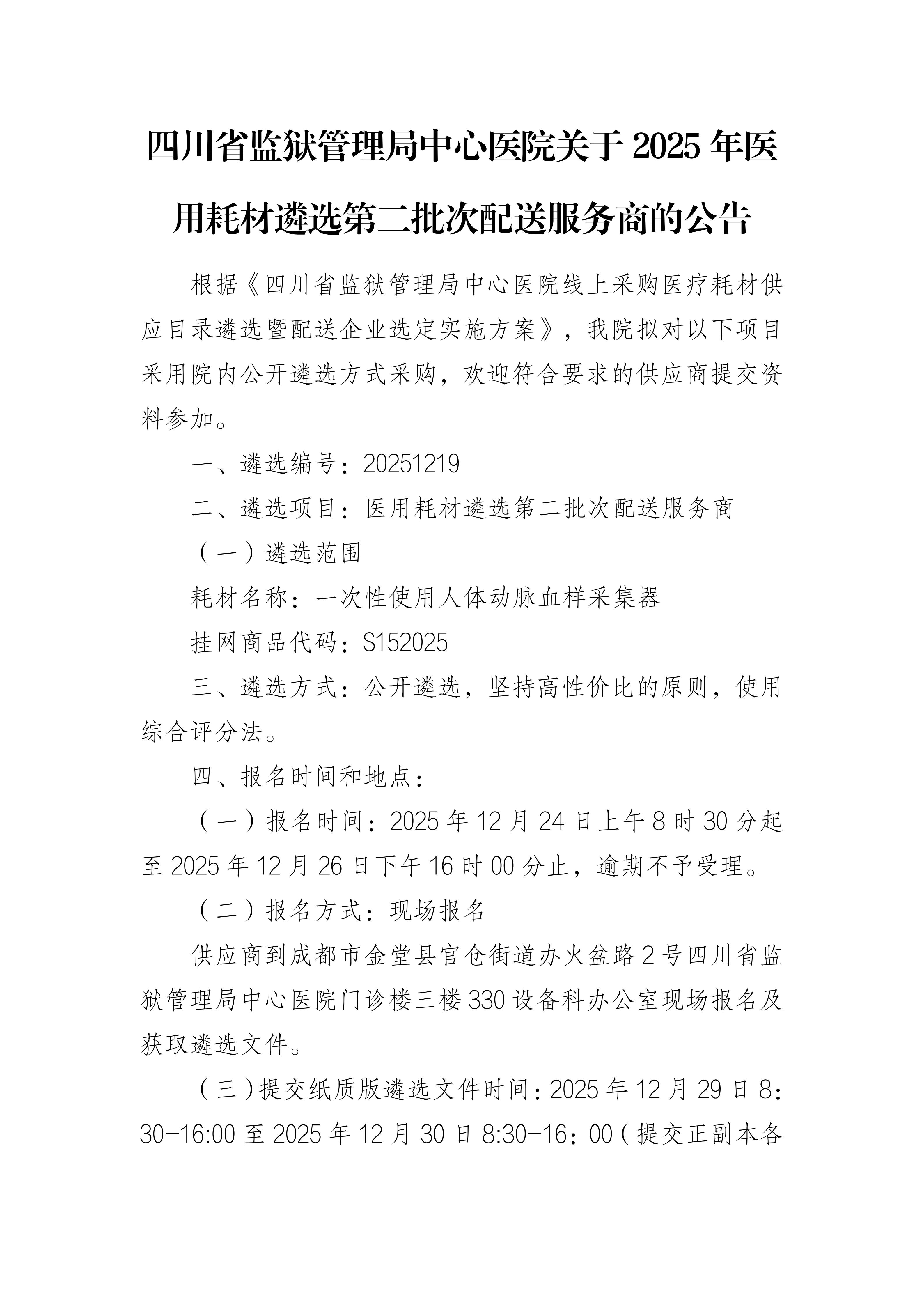 四川省监狱管理局中心医院关于2025年医用耗材遴选第二批次配送服务商的公告