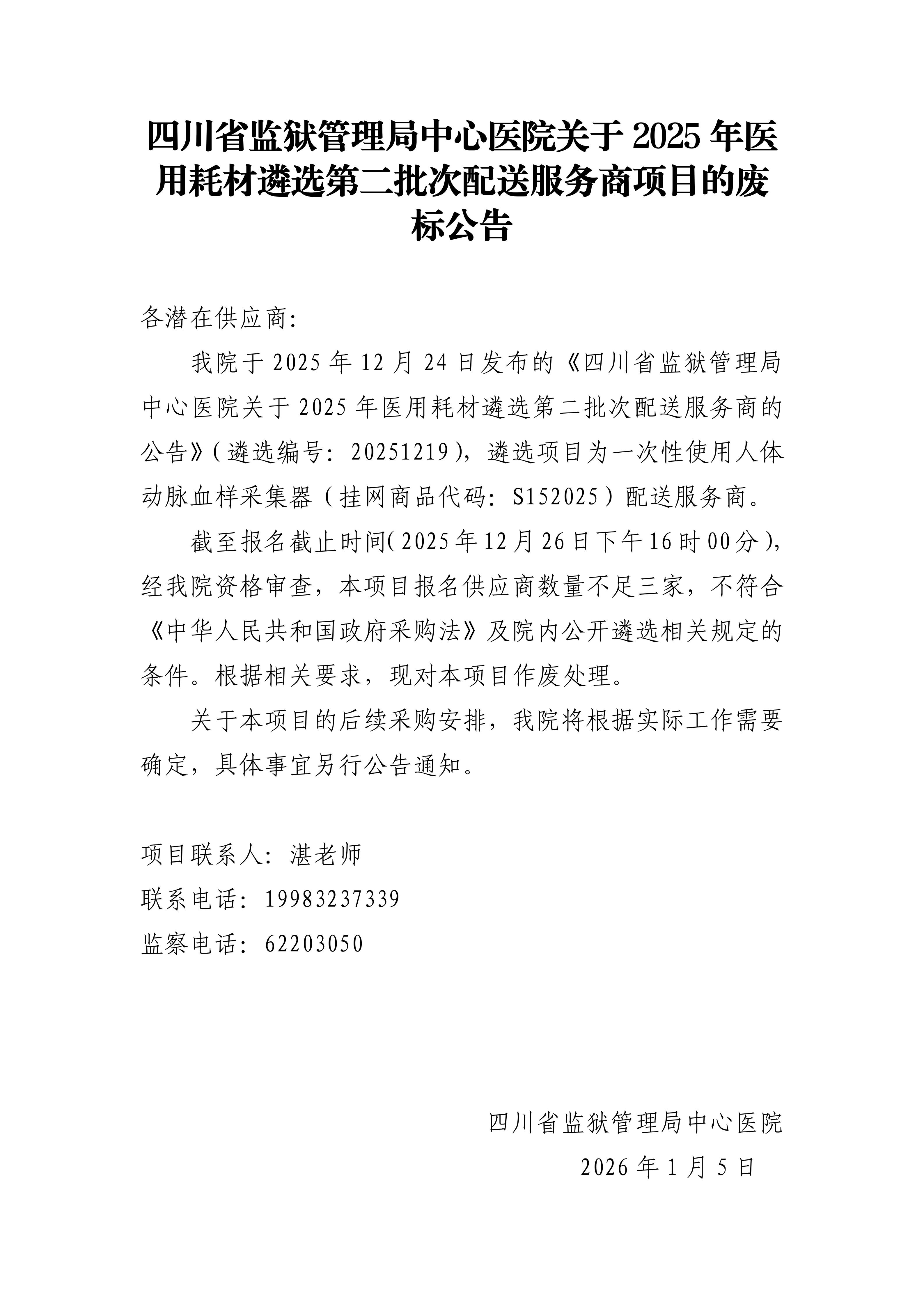 四川省监狱管理局中心医院关于2025年医用耗材遴选第二批次配送服务商项目的废标公告