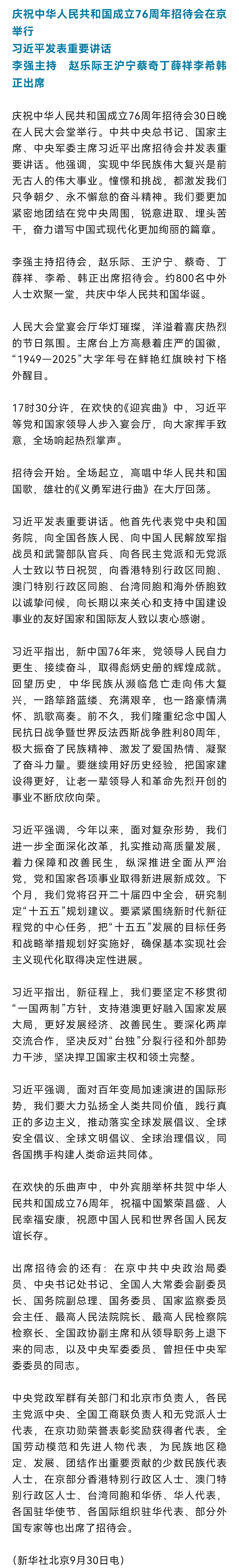 庆祝中华人民共和国成立76周年招待会在京举行 习近平发表重要讲话