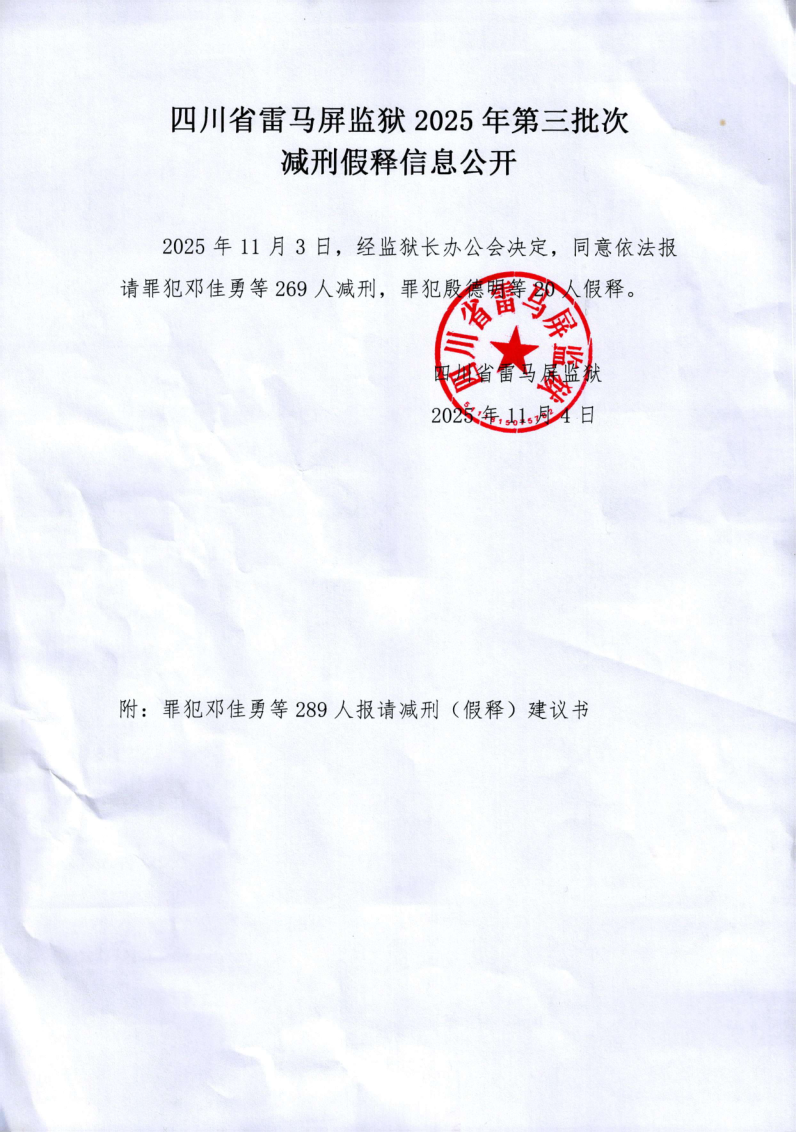 四川省雷马屏监狱2025年第三批次减刑假释信息公开