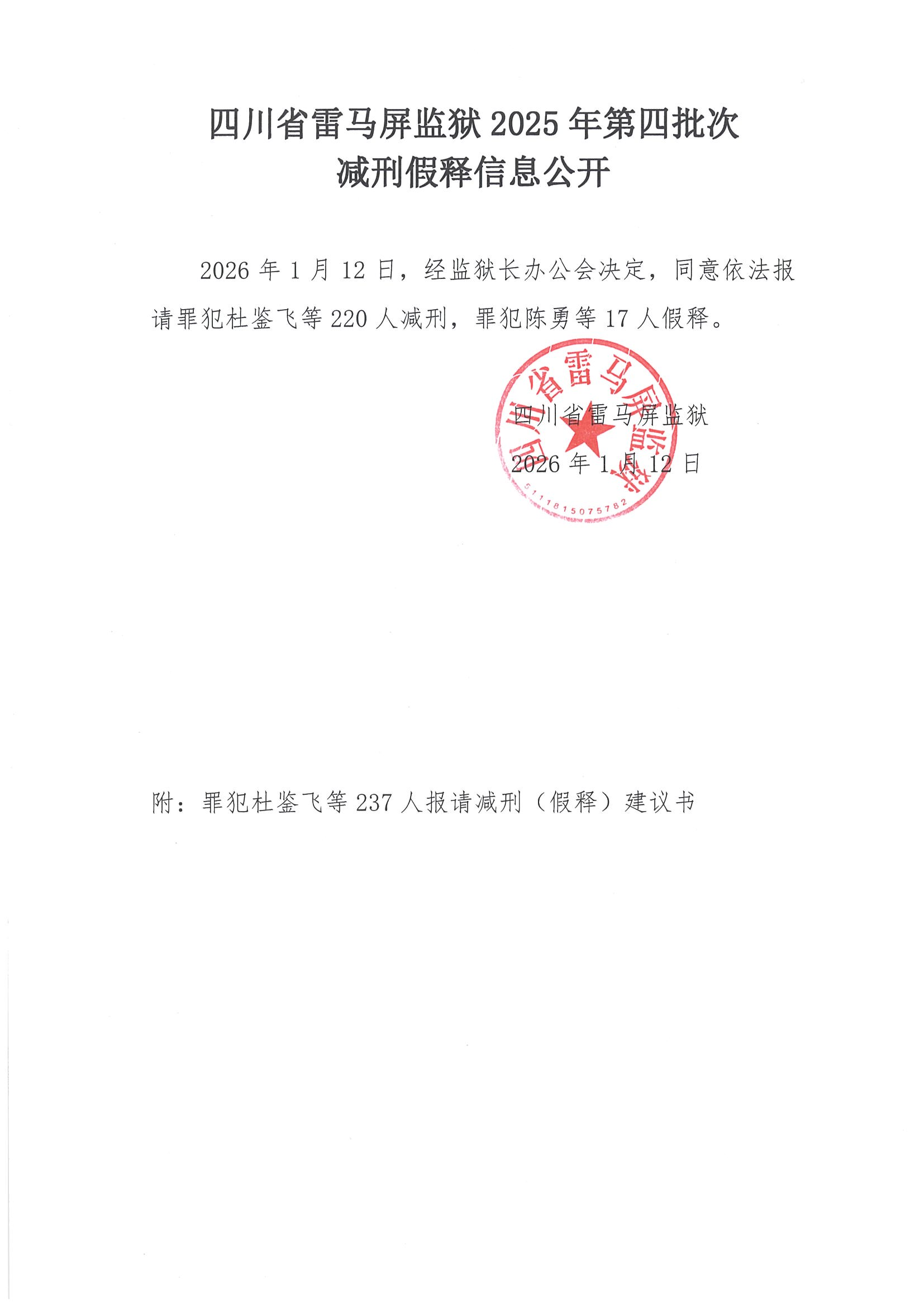 四川省雷马屏监狱2025年第四批次减刑假释信息公开
