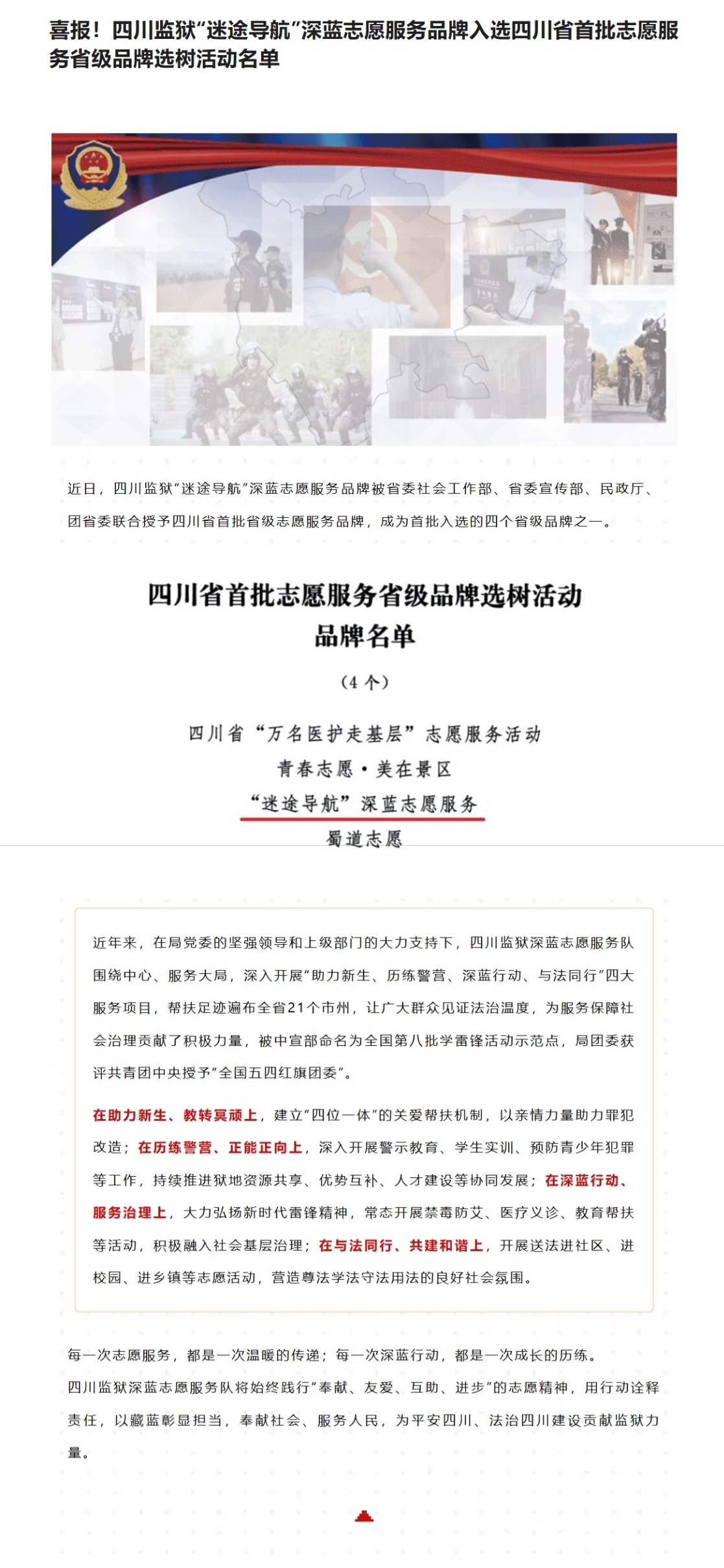 喜报!四川监狱“迷途导航”深蓝志愿服务品牌入选四川省首批志愿服务省级品牌选树活动名单