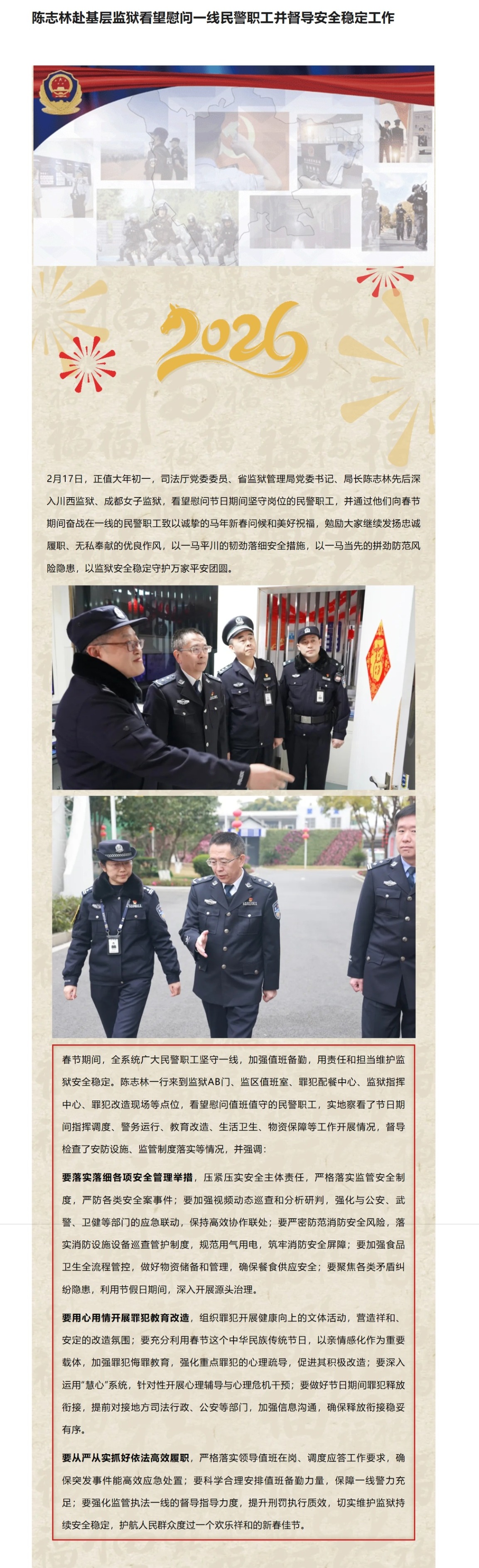 陈志林赴基层监狱看望慰问一线民警职工并督导安全稳定工作