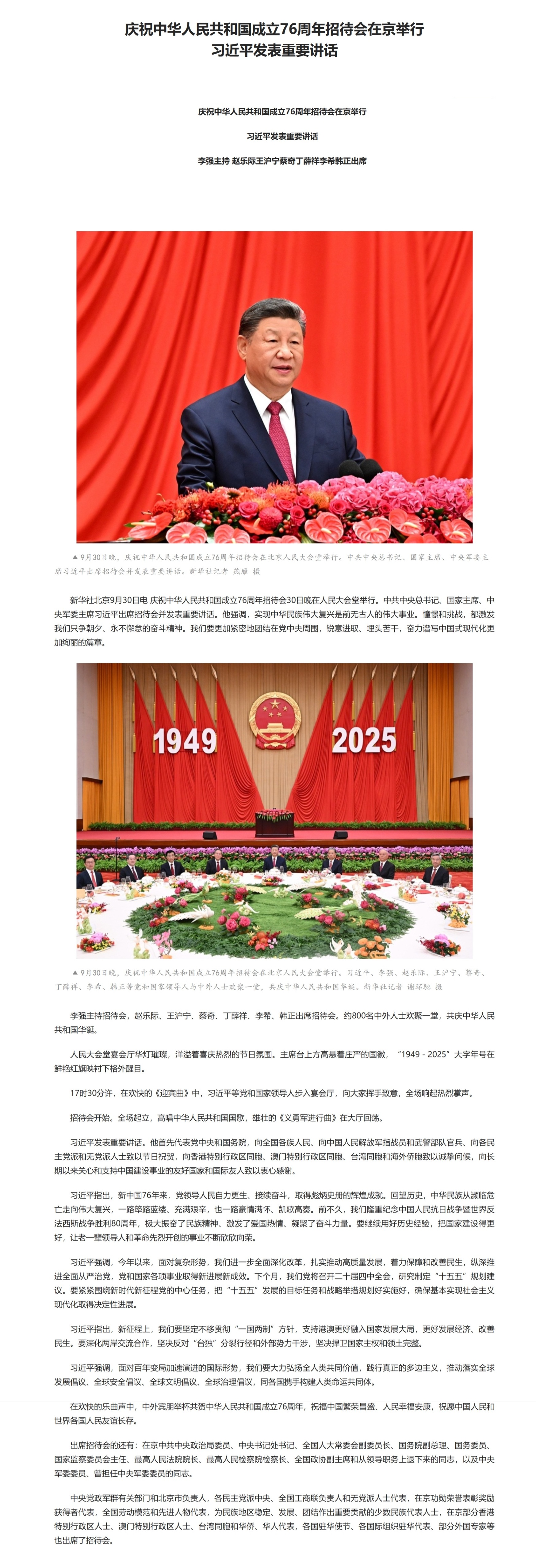 庆祝中华人民共和国成立76周年招待会在京举行习近平发表重要讲话