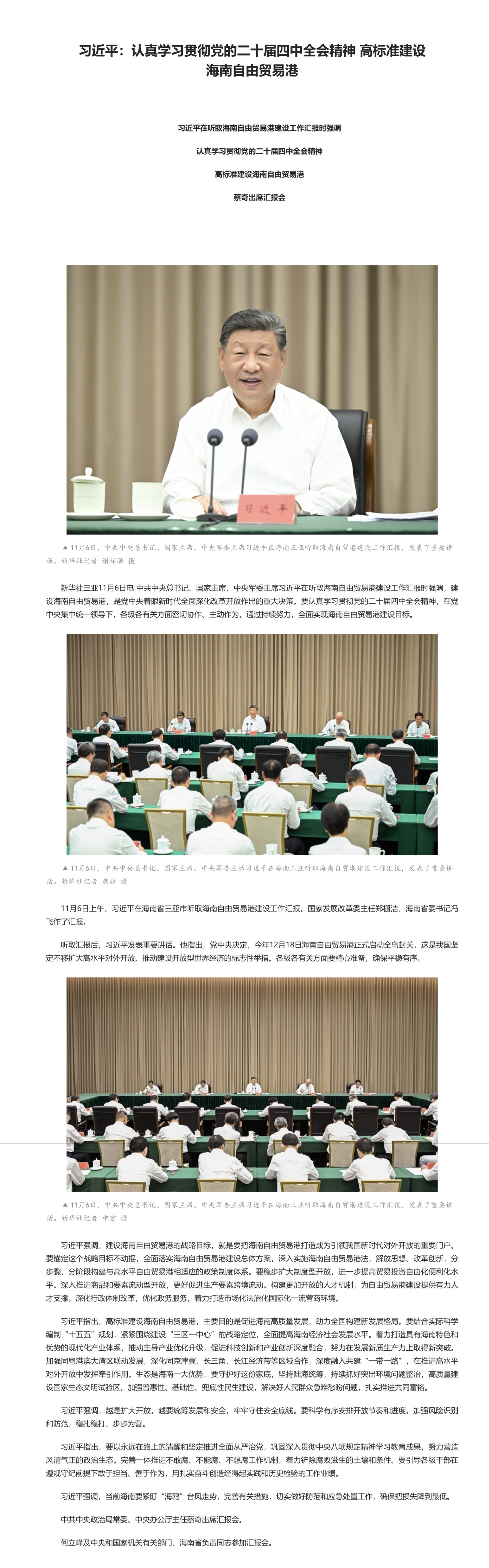 习近平:认真学习贯彻党的二十届四中全会精神 高标准建设海南自由贸易港