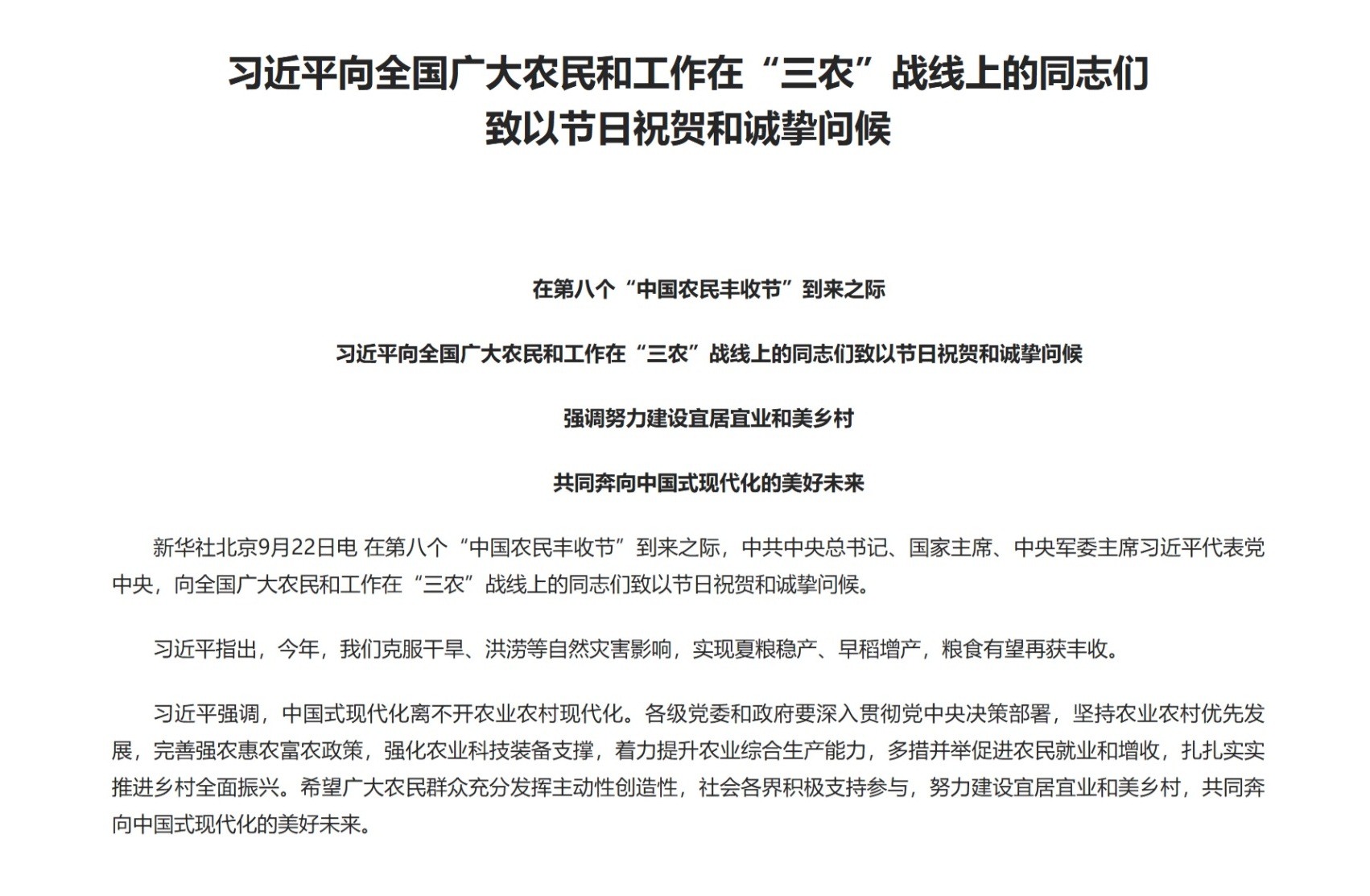 习近平向全国广大农民和工作在“三农”战线上的同志们致以节日祝贺和诚挚问候