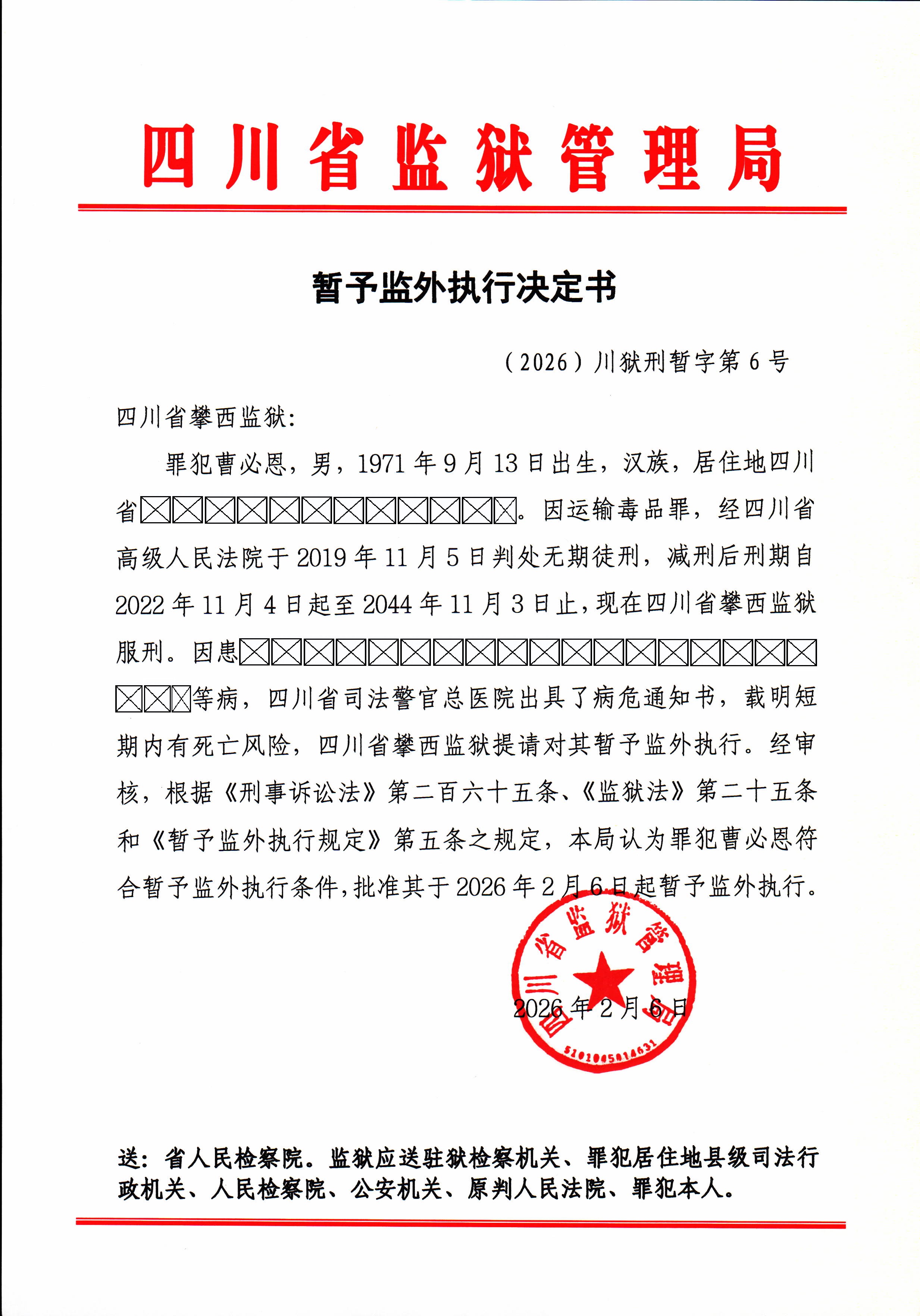 四川省监狱管理局暂予监外执行决定书