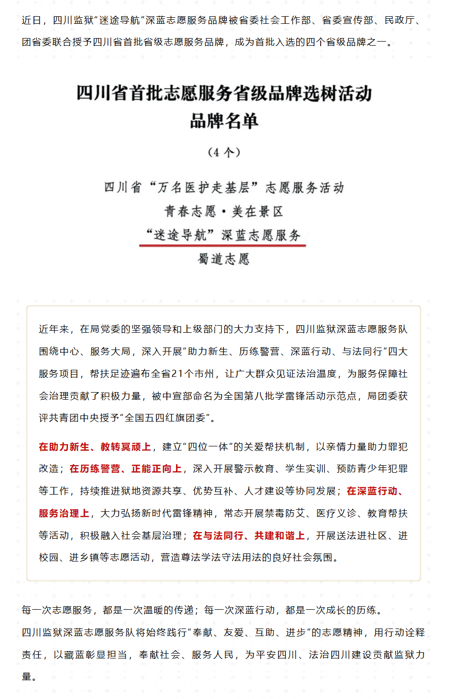 喜报!四川监狱“迷途导航”深蓝志愿服务品牌入选四川省首批志愿服务省级品牌选树活动名单