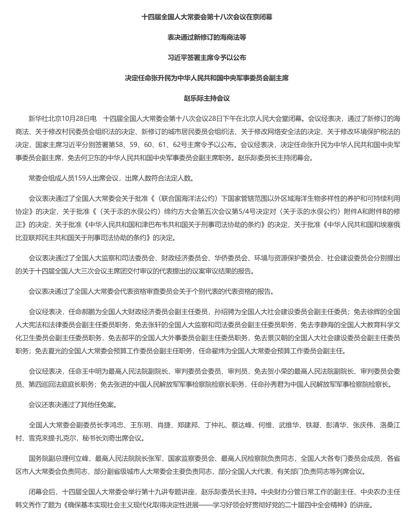 十四届全国人大常委会第十八次会议在京闭幕