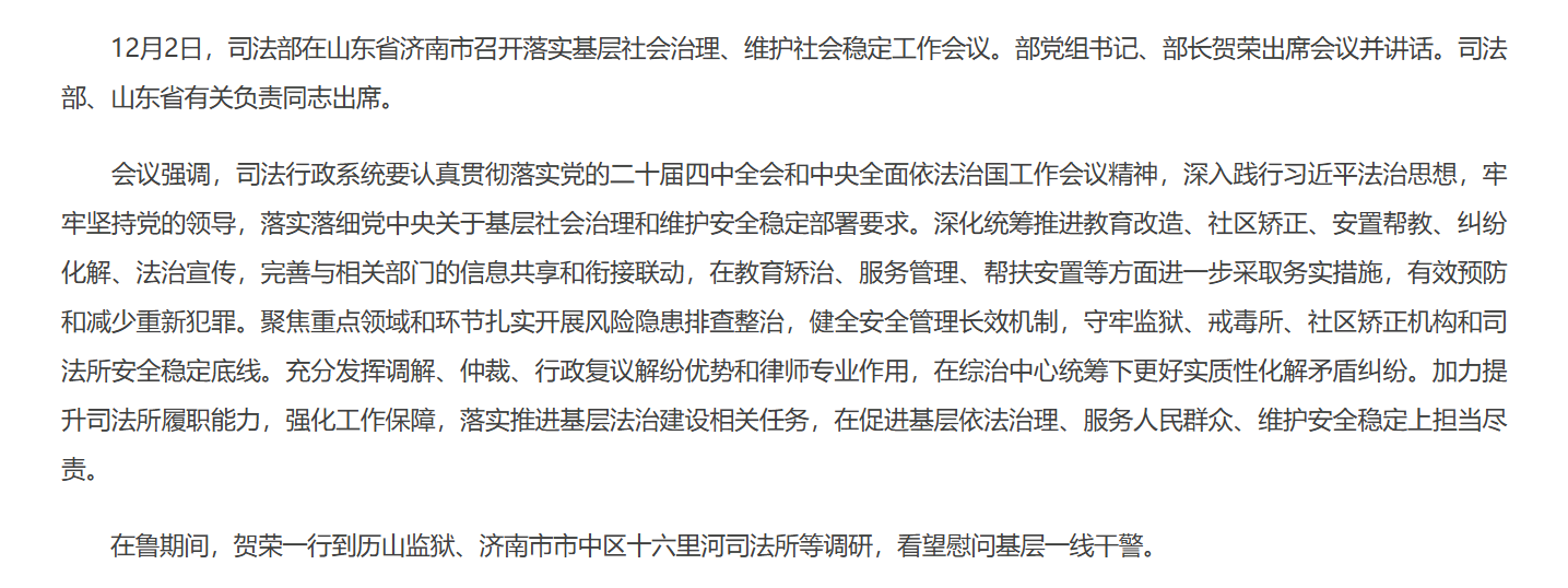 司法部:深化统筹推进相关工作 促进基层社会治理 维护安全稳定