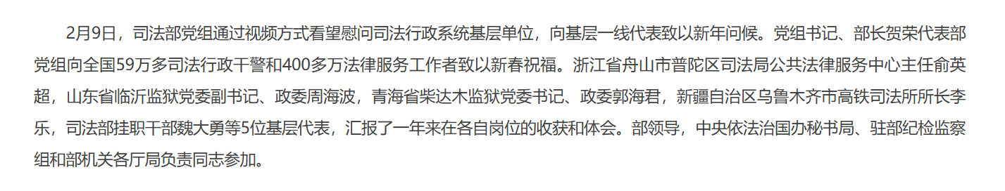 司法部党组春节前夕视频慰问司法行政