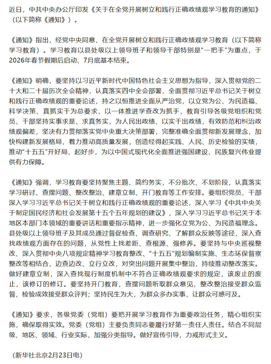 中办印发《通知》在全党开展树立和践行正确政绩观学习教育
