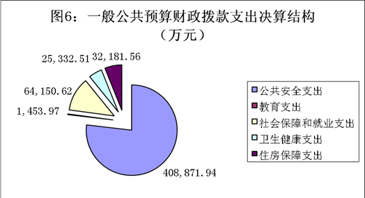 2020年一般公共预算财政拨款支出531,990.6万元,主要用于以下方面:公共安全支出(类)408,871.94万元,占76.86%;教育支出(类)1,453.97万元,占0.27%;社会保障和就业支出(类)64,150.62万元,占12.06%;卫生健康支出(类)25,332.51万元,占4.76%;住房保障支出(类)支出32,181.56万元,占6.05%。