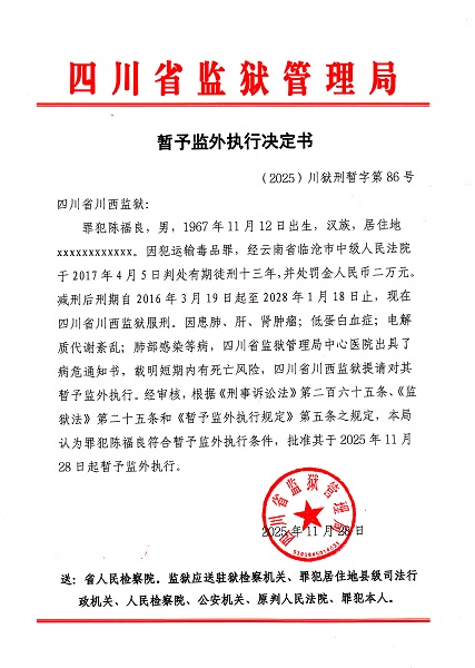四川省监狱管理局根据罪犯暂予监外执行的法定条件和程序,经会议审议通过,依法准予以下罪犯暂予监外执行: